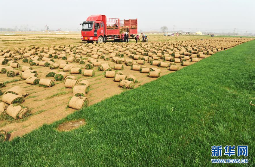 4月7日,河北省沧县鸿杨草坪种植专业合作社的工人在收卷草坪。近年来,河北省沧县张官屯乡积极调整农业结构,瞄准城市绿化市场需求,引导农民发展绿化草坪种植。目前,该乡农民成立了草坪种植专业合作社,种植草坪近千亩,带动百余农户实现增收。新华社记者 牟宇 摄
