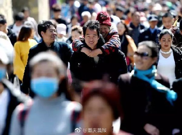 贴心的小伙子直接背起奶奶在景区内看石窟,