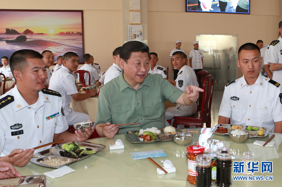 在水兵餐厅,习近平同广大官兵一起吃饭,说工作,唠家常。两份菜、一份饭、一碗粥,这一餐,朴实又简单。