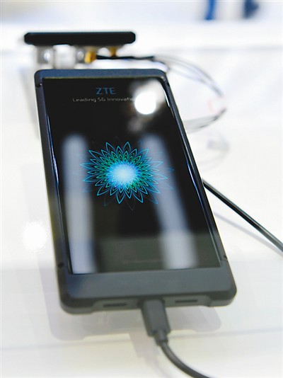 2018世界移动通信大会上,“中国智造”成为全场一大亮点。图为大会上拍摄的中兴类5G手机。新华社记者 郭求达 摄