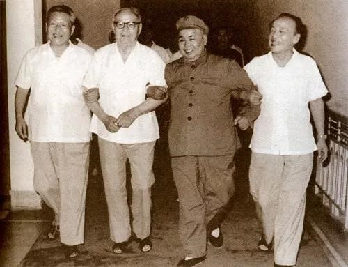 1979年6月,广东省委召开三级会议,习仲勋传达了中央同意广东在改革开放中先走一步的指示。图为习仲勋、叶剑英、许世友、杨尚昆手挽手走进会场。资料图