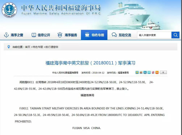 中华人民共和国福建海事局网站4月12日以中英文发布题为“福建海事局中英文航警(20180011)军事演习”的消息,全文如下: