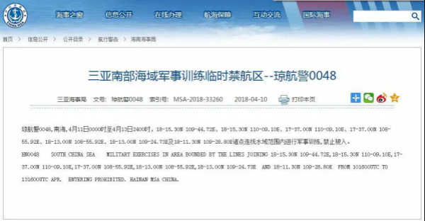 中华人民共和国海事局网站4月12日以中英文发布题为“三亚南部海域军事训练结束,撤销琼航警0048”的消息,全文如下: