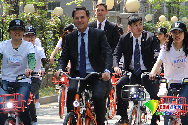 有了博鳌的基调,下午出现在北外的吕特首相满面春风,显然访华期间诸事顺利,心情大好。正式活动开始前,他还在北外荷兰语专业师生的陪伴下,一起骑着自行车游览了北外校园。