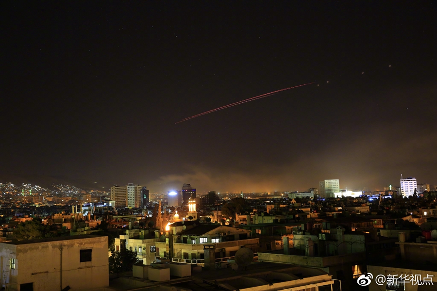叙利亚国家电视台14日报道说,当地时间14日凌晨,美国等国对叙首都大马士革发起军事行动。(新华社/美联)