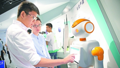 海南“互联网+”创新创业节开幕式上,嘉宾和蜂巢机器人对话。张茂摄/光明图片