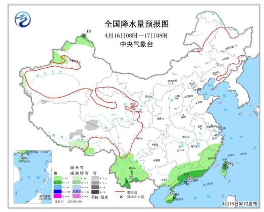 全国降水量预报图(4月15日08时-16日08时)