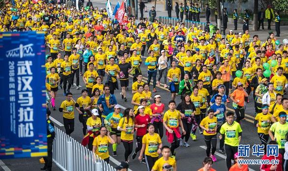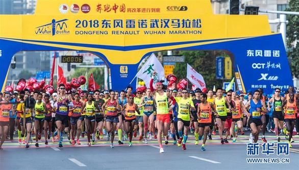 4月15日,参赛选手在比赛中出发。当日,2018武汉马拉松比赛鸣枪开跑,共吸引来自世界各地的约24000名跑友参与。 新华社记者熊琦摄