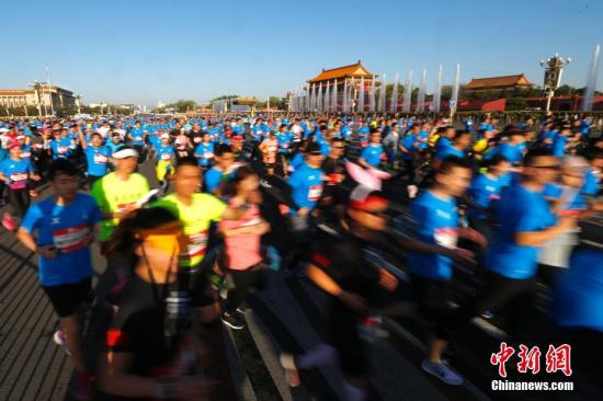 4月15日,2018北京国际长跑节—北京半程马拉松在天安门广场鸣枪起跑,来自32个国家和地区的两万余名跑步爱好者参与了此次比赛。 中新社记者 富田 摄
