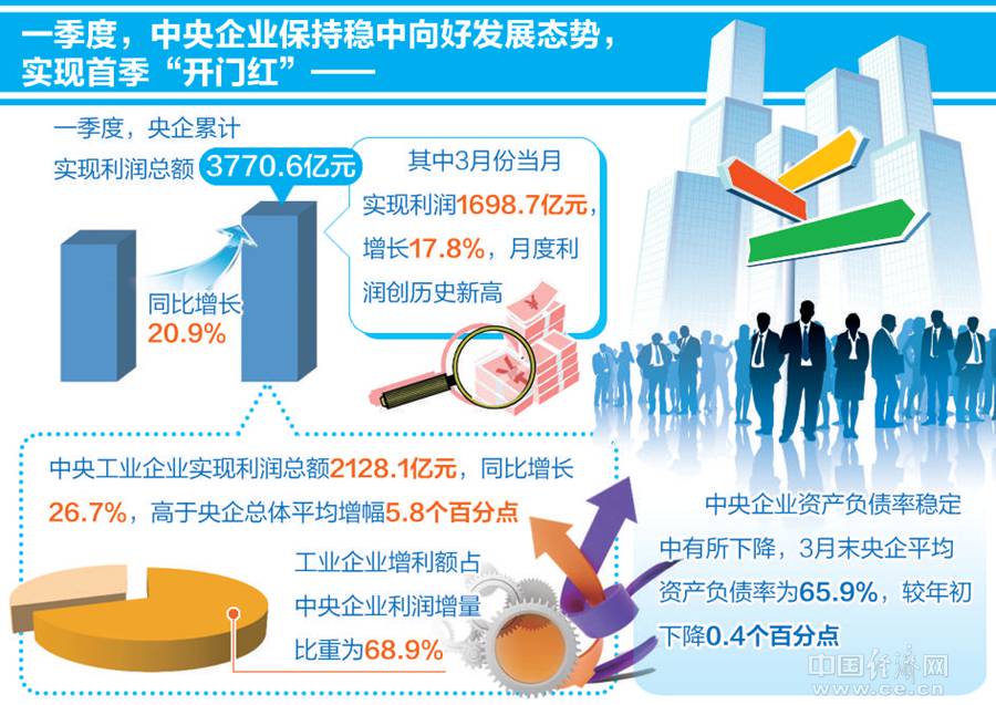 3月份,央企实现利润1698.7亿元,同比增长17.8%,月度利润创出新高。与此同时,资产负债率、人均劳动生产总值等多项指标改善,央企在提升发展质量方面取得积极成效。