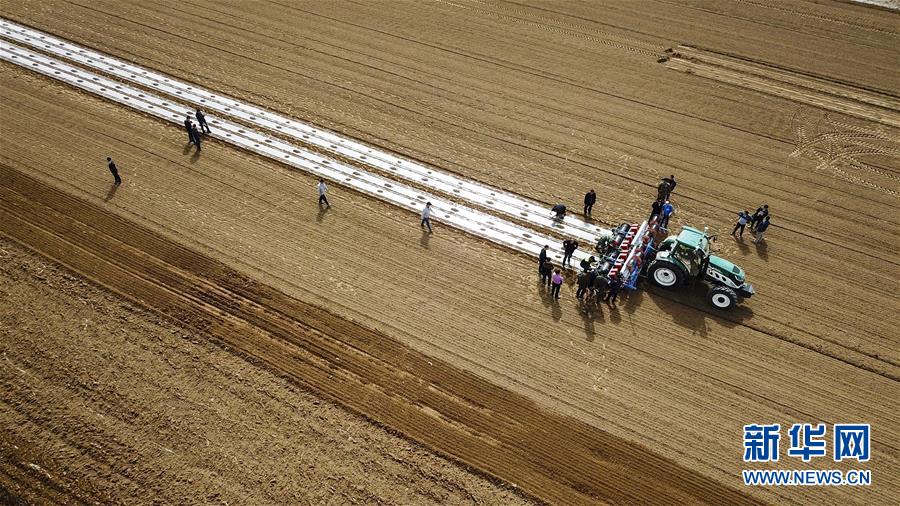 在新疆库车县牙哈镇的一处棉田,“智能拖拉机”在进行播种作业(3月23日无人机拍摄)。国家统计局4月17日发布数据,初步核算,一季度国内生产总值198783亿元,按可比价格计算,同比增长6.8%。 新华社记者 胡虎虎 摄