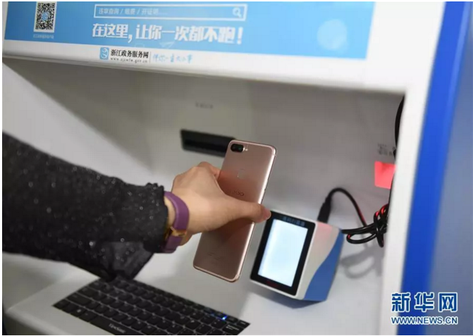浙江省衢州市行政服务中心,市民通过自助机扫描支付宝手机客户端上领取的“居民身份证网上功能凭证”办理个人业务。来源:新华网 新华社记者 黄宗治 摄
