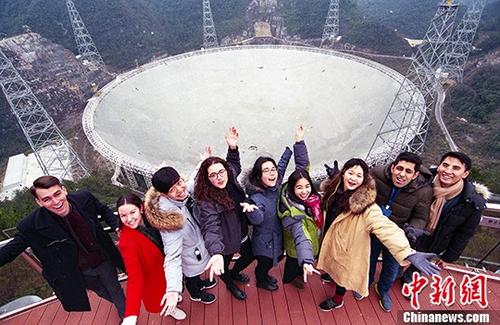 资料图:留学生在FAST观景台合影留念。 中新社记者 贺俊怡摄