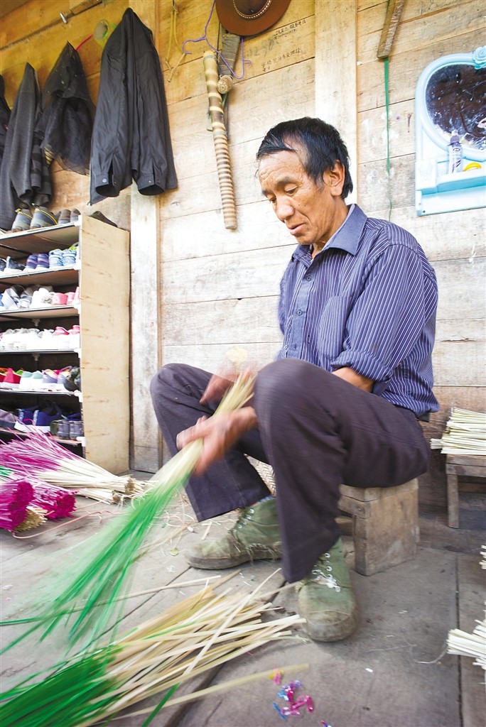 德兴乡德兴村尼玛仁青在编织“帮穹”(扁圆形竹器)。