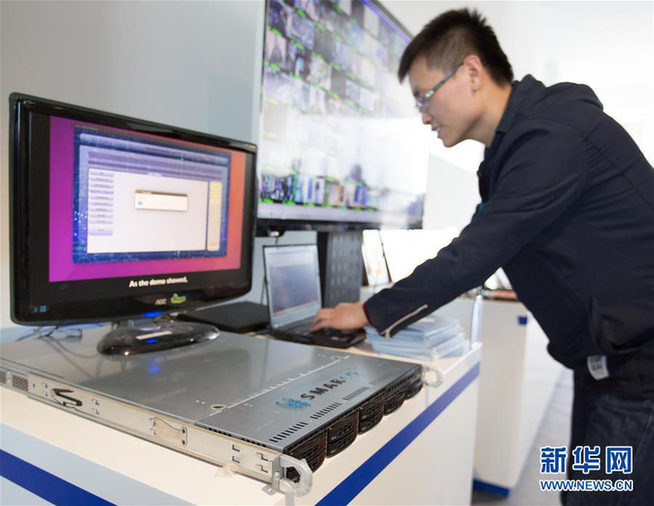 2017年12月,北京智能计算产业研究院举行的发布会上,工作人员现场演示高通量人工智能一体机的应用。(图片来源:新华社)