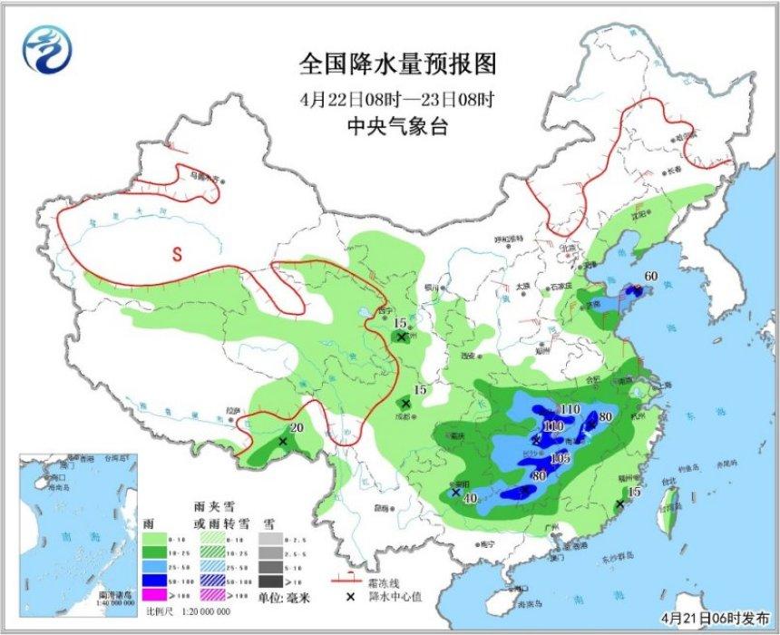 随着强降雨区的南压,22~23日江南中北部和西部、华南的部分地区有大到暴雨,局地大暴雨;上述部分地区还将伴有短时强降水和雷暴大风等强对流天气。