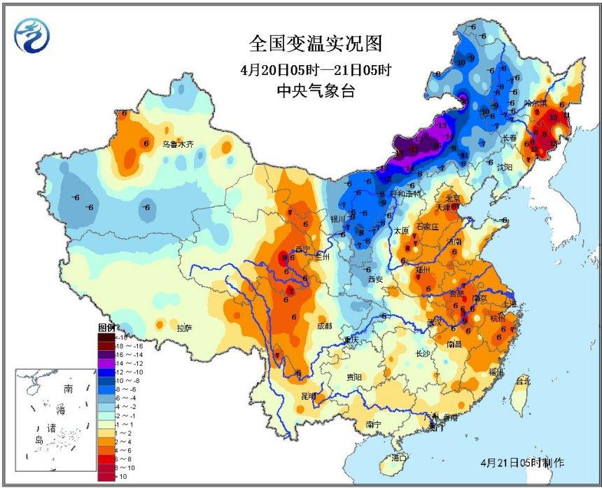 气象监测显示,今天早晨内蒙古中东部、西北地区东部及东北大部出现明显降温,其中,内蒙古中部降温幅度达12~16℃;随着冷空气的持续南下,今明两天,长江中下游以北地区将先后降温4~8℃,局地10℃以上,上述部分地区有4~6级偏北风;23~24日,长江中下游以南地区将降温4~6℃,局地8℃以上。