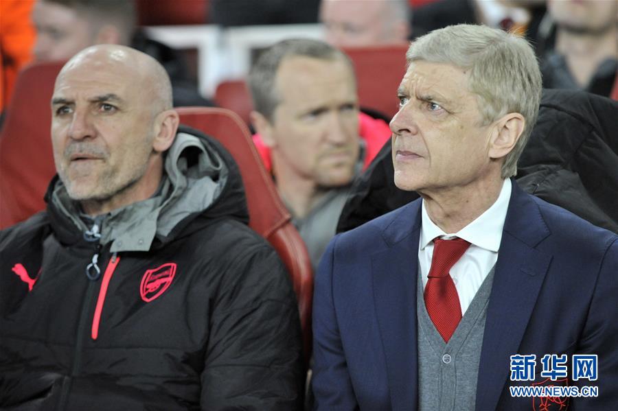 4月5日,阿森纳队主帅温格(右)在场边观战。当日,在2017/2018赛季欧罗巴联赛四分之一决赛首回合比赛中,阿森纳队主场以4比1战胜莫斯科中央陆军队。 新华社发(史蒂芬·程摄)