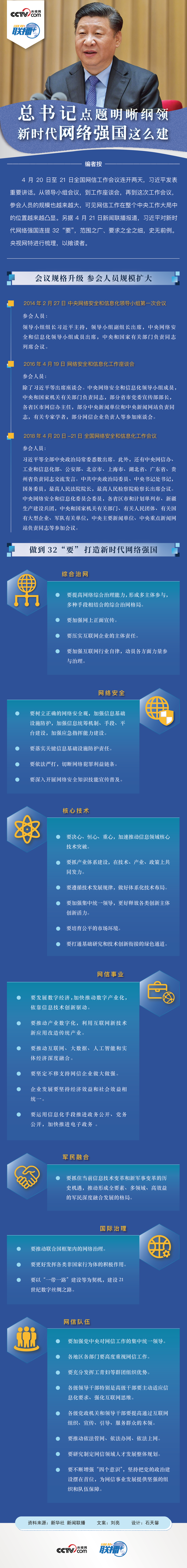 央视网消息:4月20日至21日全国网信工作会议连开两天,习近平发表重要讲话。从领导小组会议,到工作座谈会,再到这次工作会议,参会人员的规模也越来越大,可见网信工作在整个中央工作大局中的位置越来越凸显。另据4月21日新闻联播报道,习近平对新时代网络强国连提32“要”,范围之广、要求之全之细,史无前例。央视网特进行梳理,以飨读者。