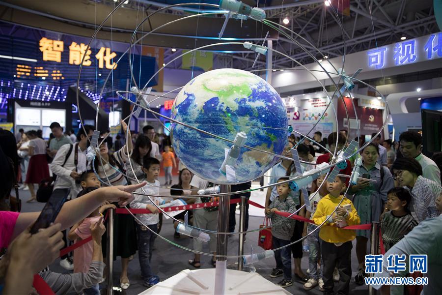 4月22日,观众在首届数字中国建设成果展览会上参观一款卫星系统模型。