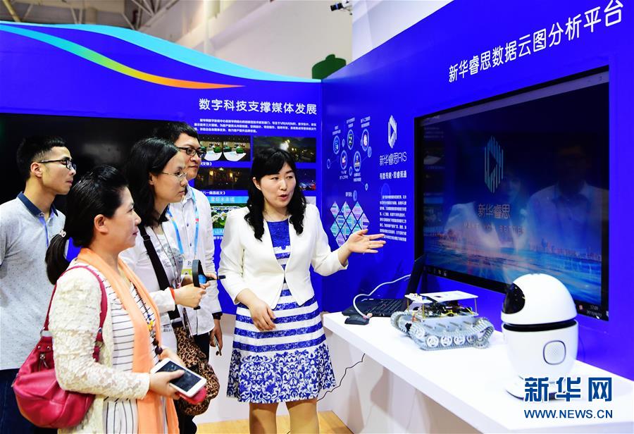 4月22日,在首届数字中国建设成果展览会上,新华网股份有限公司工作人员为观众介绍新华睿思数据云图分析平台。