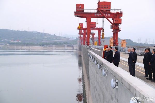 离开许家冲村,习近平来到三峡大坝,登上坝顶,极目远眺长江上下游,详细了解三峡工程建设、发电、水利、通航、生态保护等方面的情况。随后,前往通航船闸、升船机和左岸发电厂实地调研。