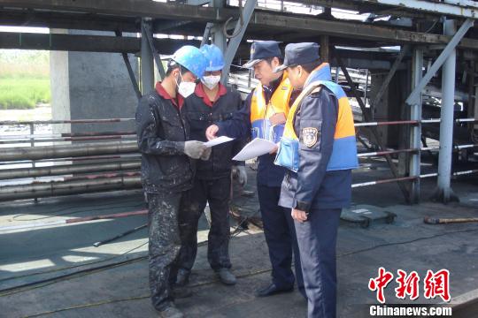 图为,海事人员正在检查危险品船舶证书 廖磊 摄
