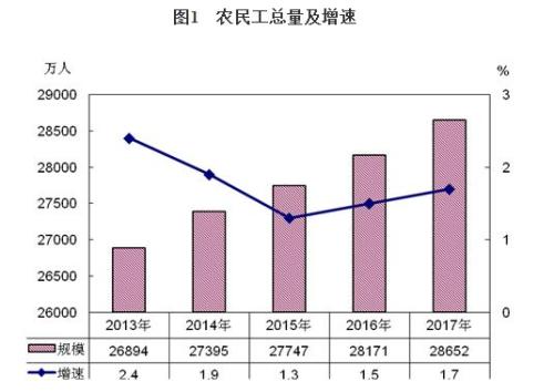 中新网4月27日电 国家统计局网站今日发布《2017年农民工监测调查报告》。报告显示,2017年农民工总量达到28652万人,比上年增加481万人,增长1.7%,增速比上年提高0.2个百分点。报告称,进城农民工随迁儿童教育得到较好保障,3-5岁随迁儿童入园率(含学前班)为83.3%,比上年提高0.6个百分点;义务教育年龄段随迁儿童的在校率为98.7%,与上年基本持平。