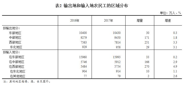从输出地看,东部地区农民工10430万人,比上年增加30万人,增长0.3%,占农民工总量的36.4%;中部地区农民工9450万人,比上年增加171万人,增长1.8%,占农民工总量的33%;西部地区农民工7814万人,比上年增加251万人,增长3.3%,占农民工总量的27.3%;东北地区农民工958万人,比上年增加29万人,增长3.1%,占农民工总量的3.3%。西部地区农民工人数增长明显快于其他地区,西部地区农民工增量占新增农民工的52.2%。
