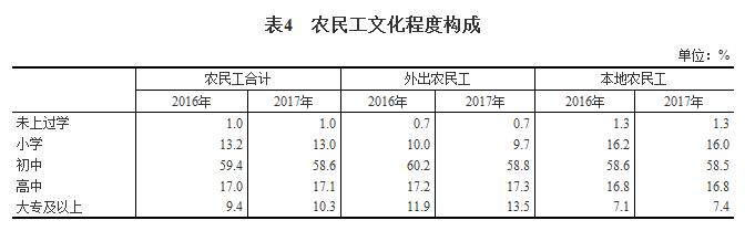 农民工中,未上过学的占1%,小学文化程度占13%,初中文化程度占58.6%,高中文化程度占17.1%,大专及以上占10.3%。大专及以上文化程度农民工所占比重比上年提高0.9个百分点。外出农民工中,大专及以上文化程度的占13.5%,比上年提高1.6个百分点;本地农民工中,大专及以上文化程度的占7.4%,比上年提高0.3个百分点。