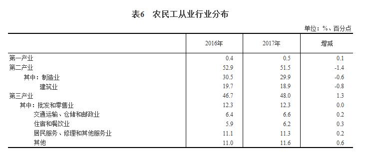 报告显示,从事第二产业的农民工比重为51.5%,比上年下降1.4个百分点。其中,从事制造业的农民工比重为29.9%,比上年下降0.6个百分点;从事建筑业的农民工比重为18.9%,比上年下降0.8个百分点。从事第三产业的农民工比重为48%,比上年提高1.3个百分点。其中,从事批发和零售业的农民工比重为12.3%,与上年持平;从事交通运输、仓储和邮政业,住宿和餐饮业,居民服务、修理和其他服务业的农民工比重分别为6.6%、6.2%和11.3%,分别比上年提高0.2、0.3、0.2个百分点。此外,农民工在金融业,教育,文化、体育和娱乐业等服务业的从业比重虽然较低,但占比在逐年提高。