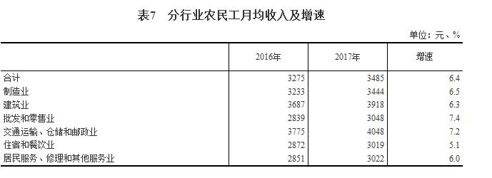 农民工月均收入3485元,比上年增加210元,增长6.4%,增速比上年回落0.2个百分点。分行业看,制造业,住宿和餐饮业,居民服务、修理和其他服务业收入增速分别比上年回落2.4、0.4和0.1个百分点;建筑业,批发和零售业,交通运输、仓储和邮政业农民工月均收入增速分别比上年提高1.2、2.9和1.0个百分点。