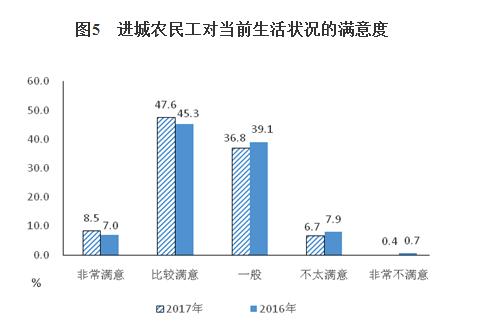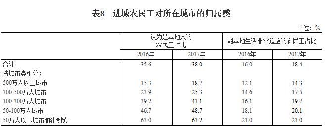 报告显示,进城农民工对所在城市的归属感提高。进城农民工中,38%认为自己是所居住城市的“本地人”,比上年提高2.4个百分点。从进城农民工对本地生活的适应情况看,表示对本地生活非常适应和比较适应的占80.4%,一般的占18.3%,不太适应和非常不适应的占1.3%。