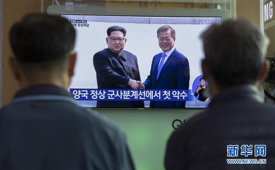 4月27日,在韩国首尔火车站,人们观看韩朝首脑会晤的电视画面。