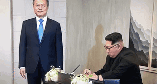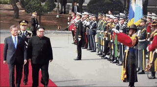 随后二人共同检阅仪仗队,这是历史上朝鲜领导人第一次检阅韩国三军仪仗队。文在寅说:“今天的仪仗队,由于场地的原因,只能简单举行。以后如果有机会到青瓦台的话,可以招待得更好。”金正恩随即表示,如果韩方邀请,自己随时都可以去。