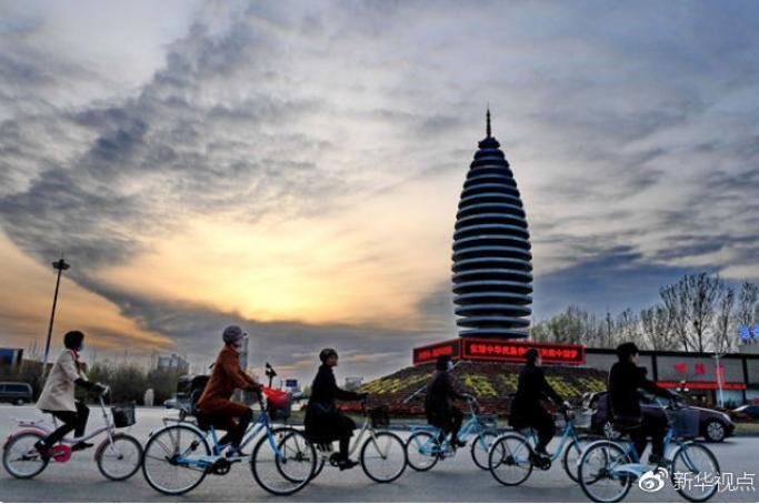 ↑市民在河北雄安新区容城县县城道路上骑行(3月29日摄)。新华社记者 牟宇 摄