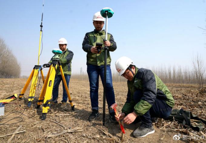 ↑中铁上海工程局集团京雄城际铁路五标项目部工作人员在河北霸州进行坐标放样。