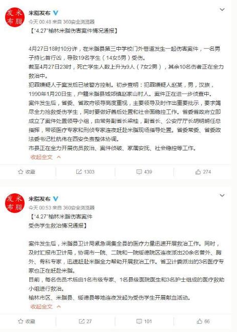 今天凌晨,中共米脂县委宣传部官方微博发布关于“4.27”榆林米脂伤害案件的情况通报和受伤学生救治的情况通报,具体内容如下: