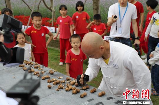 中新网佛山4月30日电 (程景伟李星凯)29日,广东佛山武术协会副主席黎伟军再度向手劈核桃发起挑战,最终在60秒内用手劈碎337颗核桃,打破了其去年55秒手劈302颗核桃的纪录。