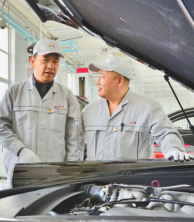 图为吴殿维(左)和同事正在对红旗轿车进行检查。
