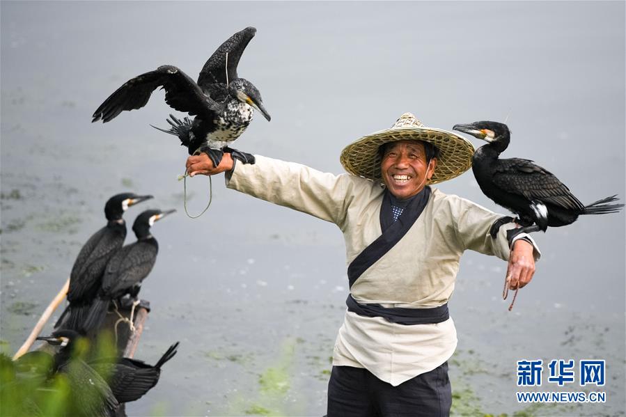 4月29日,在灵璧县浍沟镇濉河上,村民在捕鱼前向游客展示鸬鹚。当日是“五一”小长假第一天,安徽省灵璧县浍沟镇举办鸬鹚捕鱼民俗文化节,吸引众多游客及周边村民前来观赏。新华社记者 张端 摄