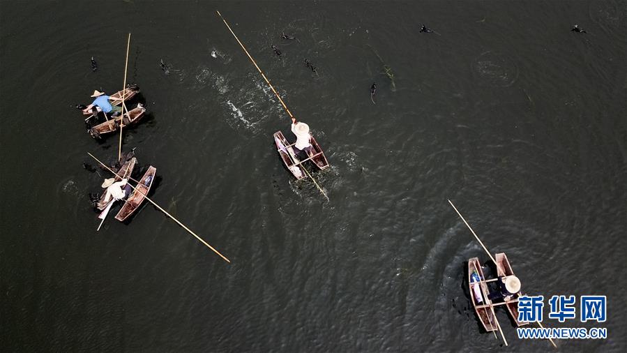 4月29日,在灵璧县浍沟镇濉河上,村民进行鸬鹚捕鱼表演(无人机拍摄)。当日是“五一”小长假第一天,安徽省灵璧县浍沟镇举办鸬鹚捕鱼民俗文化节,吸引众多游客及周边村民前来观赏。新华社记者 张端 摄