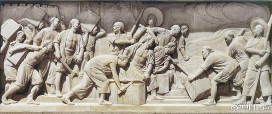 殷双喜说:“就说历史是人民创造的,人民是历史的真正的主人,整个纪念碑的设计思路,突出毛主席提出的人民这个主题。所以就把英雄人物和一些著名的这些历史人物去掉了,就是这上面都是人民群众!”
