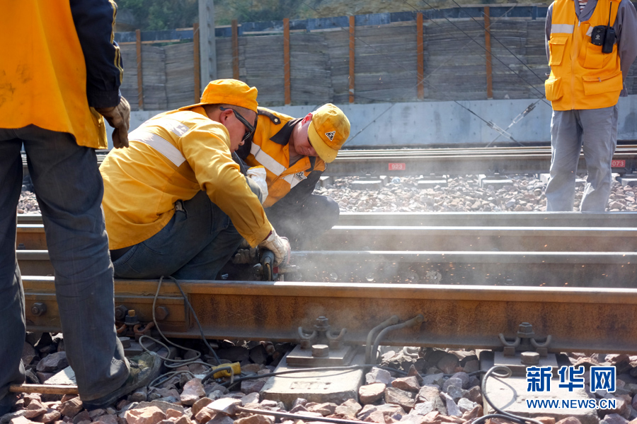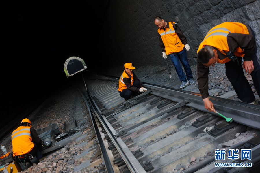 铁路职工在隧道作业。他们的工作被称为“改道”,要把两条铁轨距离与标准数据的误差控制在-2mm到 6mm之间。新华网陈俊松摄