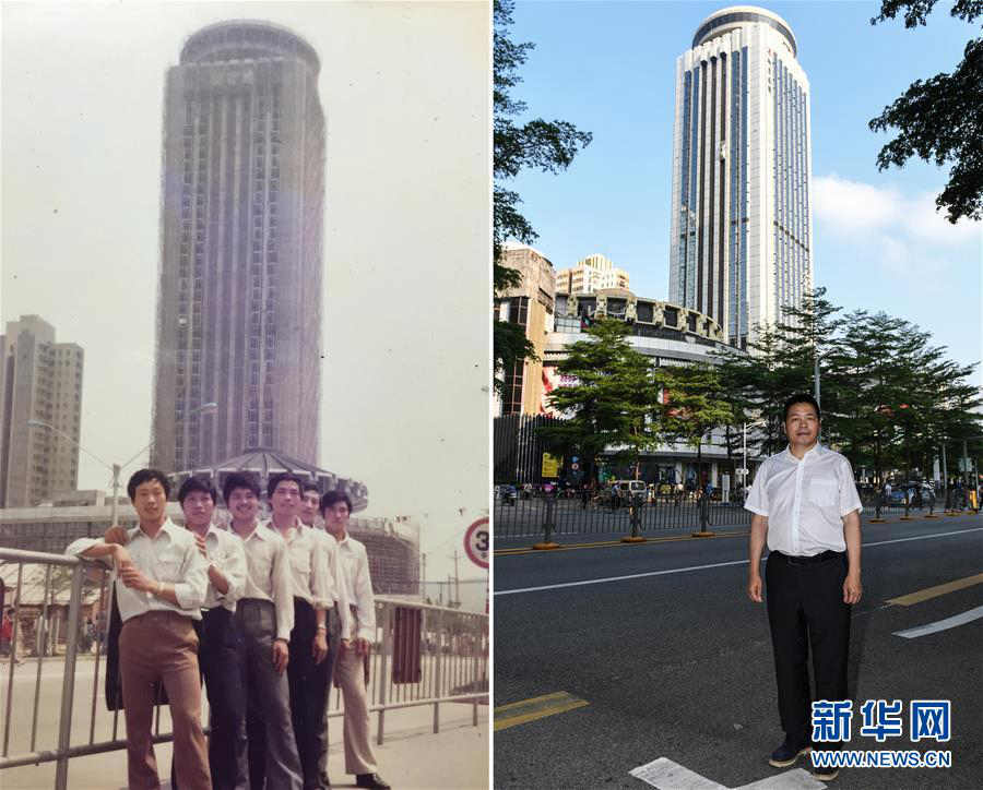 拼版照片:左图为1985年3月,贾金宣(右三)与同事在深圳国际贸易中心大厦前留影(资料照片);右图为4月28日,贾金宣在深圳国际贸易中心大厦前留影(新华社记者毛思倩摄)。新华社发