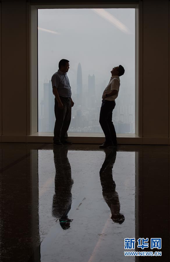 4月27日,黄松源(右)与贾金宣在已经装饰完工的深圳平安金融中心83层谈起建设过程中的趣事时开心大笑。新华社记者刘大伟摄