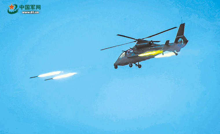 近日,陆军航空兵某部组织跨昼夜海上实弹射击训练,检验部队作战能力。图为武装直升机发射导弹。 李士龙摄