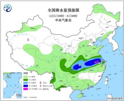 图3 全国降水量预报图(5月5日08时-6日08时)