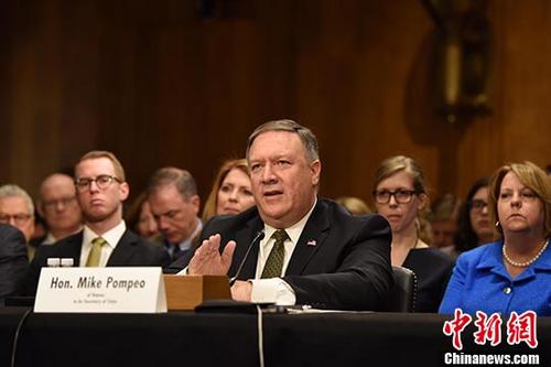当地时间4月12日,美国参议院外交委员会就迈克·蓬佩奥担任美国国务卿举行提名听证会,图为蓬佩奥在听证会现场阐述外交政策。中新社记者邓敏 摄