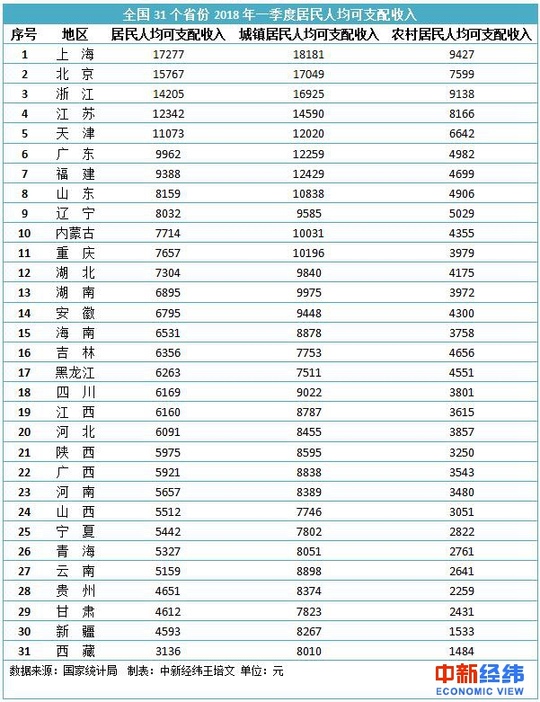 中新经纬客户端(微信公众号:jwview)梳理发现,北京、天津、辽宁、上海、江苏、浙江、福建、山东、广东2018年一季度居民人均可支配收入超过全国平均水平。